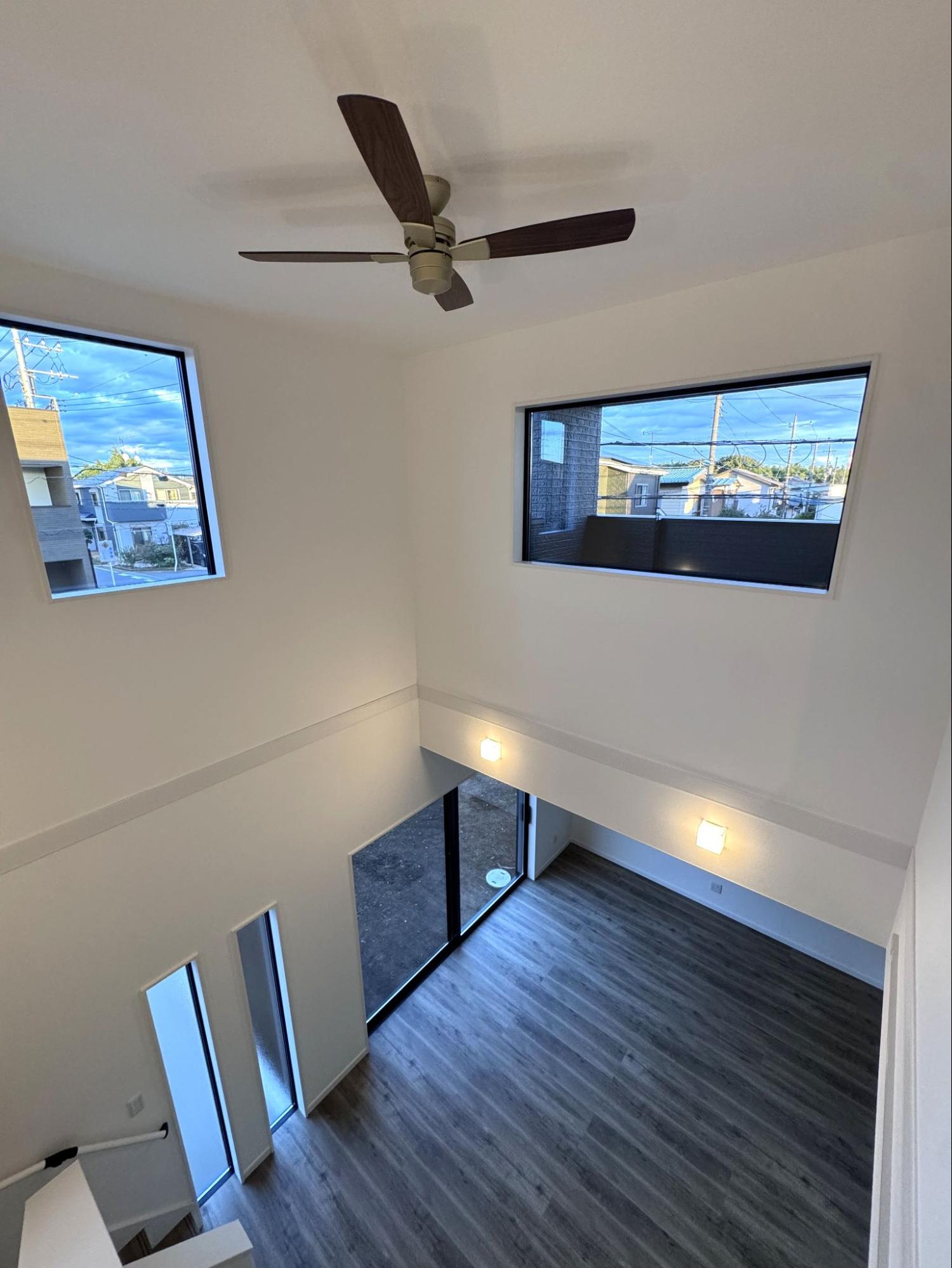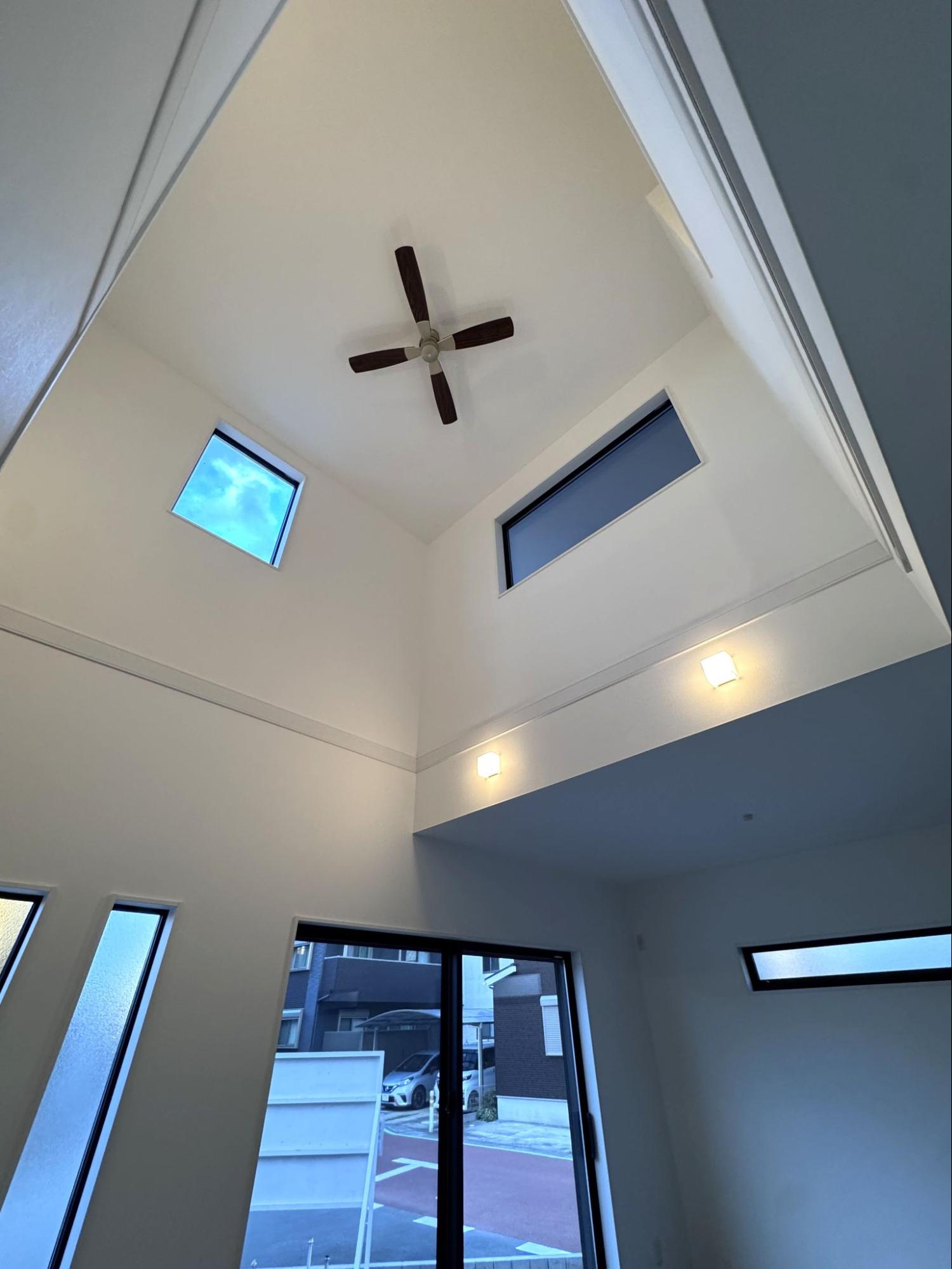 約8帖の吹き抜けにはシーリングファンを設け、空気の循環を促進。夏も冬も快適に過ごせる工夫が施されています。