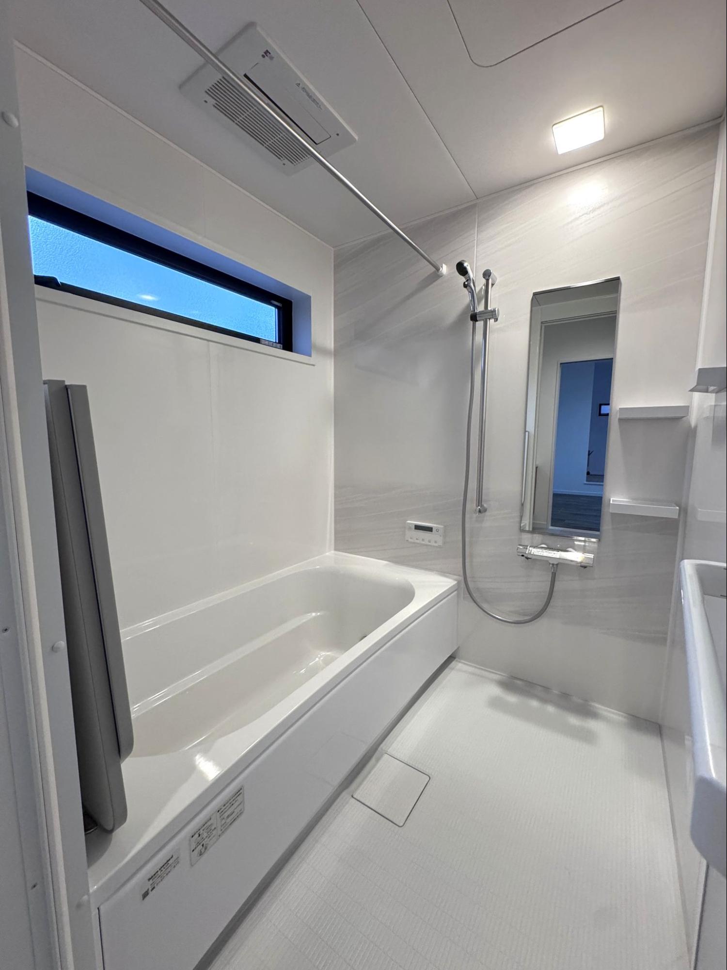 キッチンから廊下を抜けた先にあるバスルーム。白を基調としており清潔感あふれる空間です。