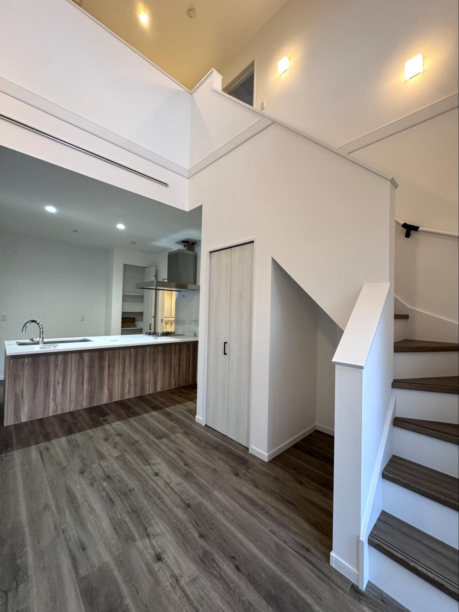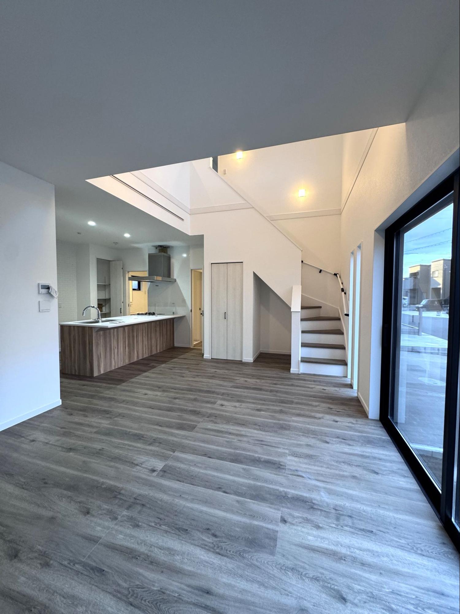広々としたLDK。高い天井と吹き抜けが、開放感のある暮らしを演出します。