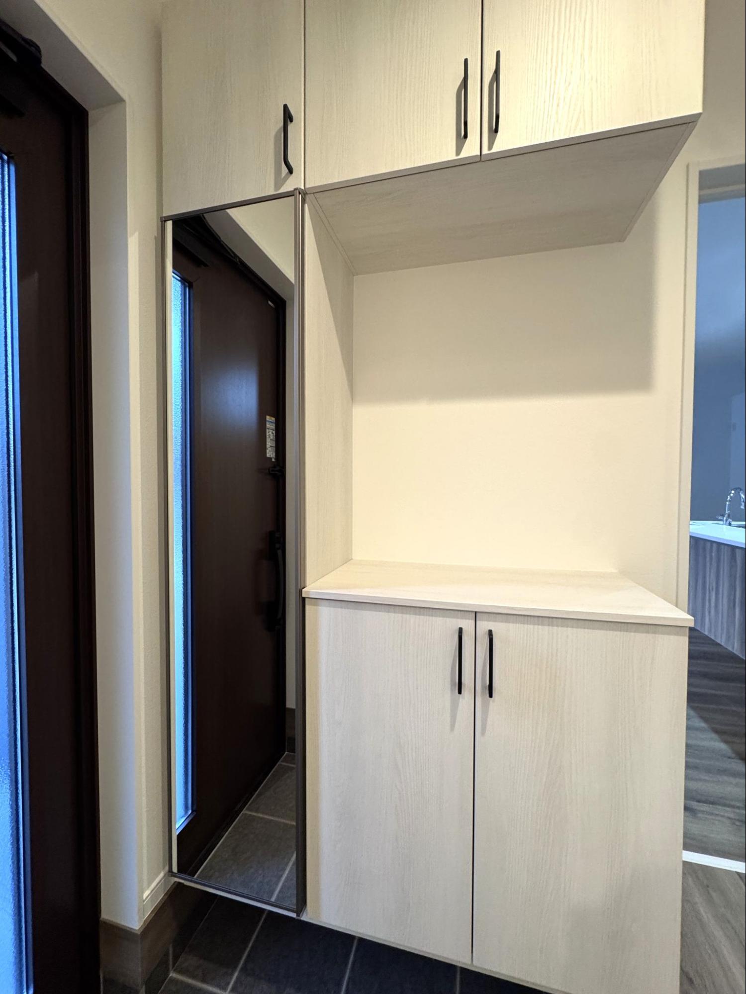 玄関を入ると大容量の収納と姿見ミラーがございます。靴や小物をすっきりと整理できます。また、外出前の身だしなみをチェックするのにも便利です。