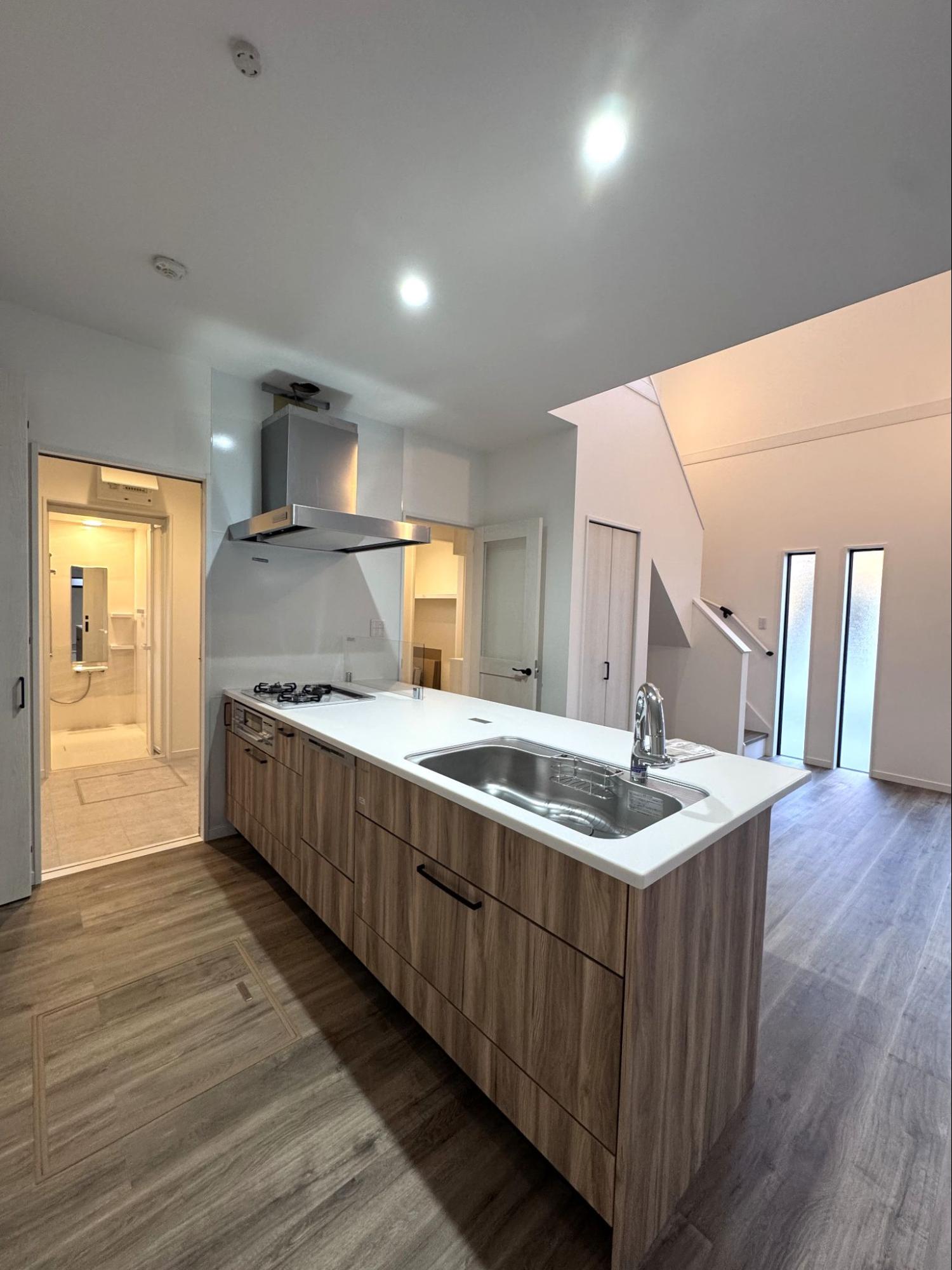 木目調のキッチン。回遊性のある動線で、料理中も家族とのコミュニケーションが取りやすいレイアウトです。