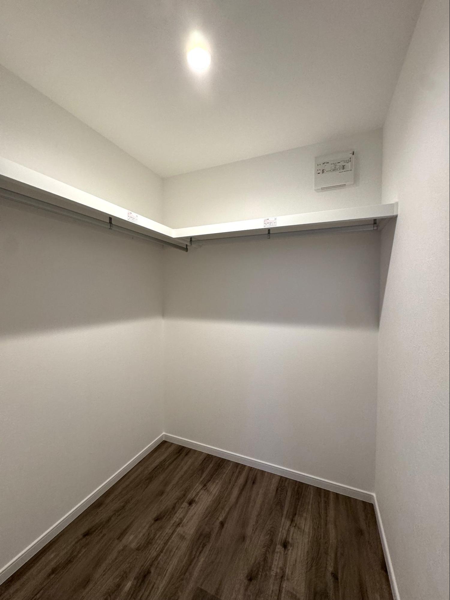 洋室の奥にあるウォークインクローゼット。衣類だけでなく、季節家電や小物もまとめて収納できます。