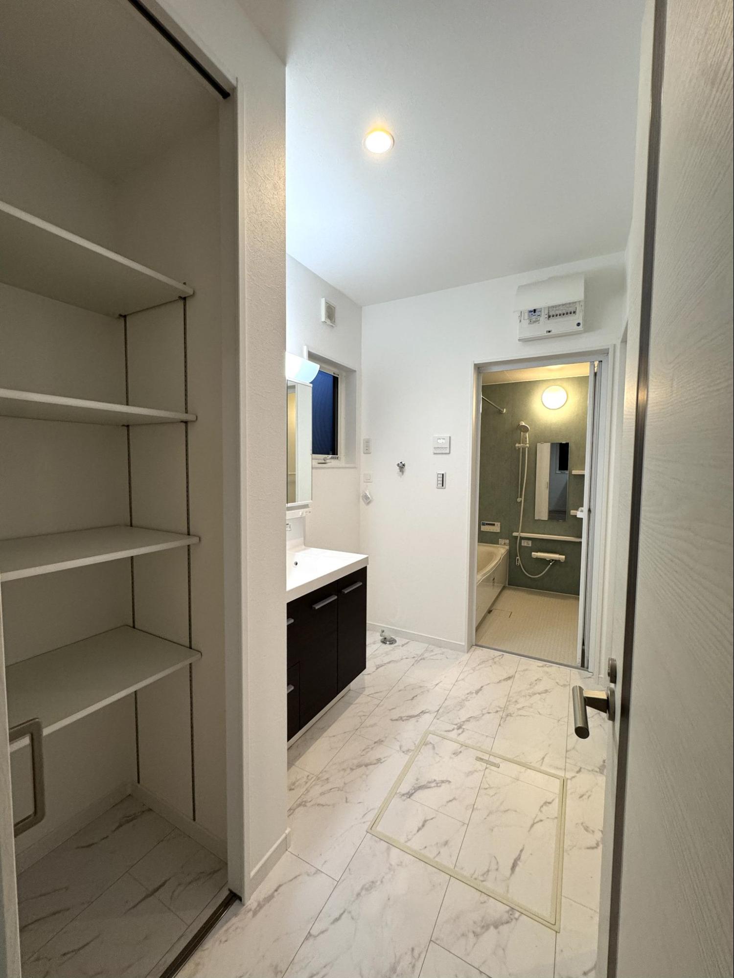 リネン庫も備えており、タオルや洗剤などのストックを収納するのに便利です。