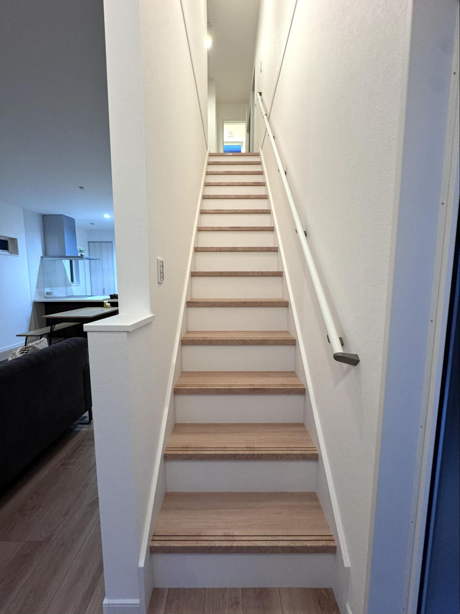 リビング横の階段。手すりがついているので小さなお子様や、ご高齢の方でも安心して移動ができます。